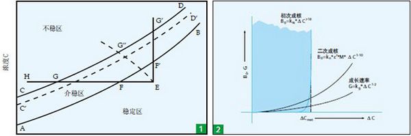 根據(jù)大量試驗的結果證實,溶液的過飽和與結晶的關系可用上圖1表示;圖中的AB 線為普通的溶解度曲線,CD 線代表溶液過飽和而能自發(fā)地產生晶核的濃度曲線( 超溶解度曲線),它與溶解度曲線大致平行。這兩根曲線將濃度——溫度圖分割為三個區(qū)城。在 AB 曲線以下是穩(wěn)定區(qū),在此區(qū)中溶液尚未達到飽和,因此沒有結晶的可能。AB 線以上為過飽和溶液區(qū),此區(qū)又分為兩部分:在 AB 與 CD 線之間稱為介穩(wěn)區(qū),在這個區(qū)域中,不會自發(fā)地產生晶核,但如果溶液中已加了晶種, 這些晶種就會長大。 CD 線以上是不穩(wěn)區(qū),在此區(qū)域中,溶液能自發(fā)地產生晶核。若原始濃度為 E 的潔凈溶液在沒有溶劑損失的情況下冷卻到 F 點,溶液剛好達到飽和,但不能結晶,因為它還缺乏作推動力的過飽和度。從F 點繼續(xù)冷卻到 G 點的一段期間,溶液經過介穩(wěn)區(qū),雖已處于過飽和狀態(tài),但仍不能自發(fā)地產生晶核。只有冷卻到 G點后,溶液中才能自發(fā)地產生晶核,越深入不穩(wěn)區(qū)(例如達到 H 點),自發(fā)產生的晶核也越多。由此可見,超溶解度曲線及介穩(wěn)區(qū)、不穩(wěn)區(qū)這些概念對于結晶過程有重要意義。把溶液中的溶劑蒸發(fā)一部分,也能使溶液達到過飽和狀態(tài),圖中 EF ’ G’線代表此恒溫蒸發(fā)過程。在工業(yè)結晶中往合并使用冷卻和蒸發(fā),此過程可由 EG’’線代表。