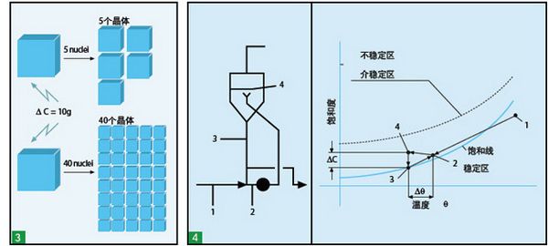 混合對過飽和度和晶核的形成有重要的影響,它是結晶器設計的基礎。上圖4為一真空強制循環(huán)結晶器。原料液從狀態(tài)1進入結晶器與結晶器內的狀態(tài)3 的溶液相混合變成狀態(tài)2,經過泵的輸送到達狀態(tài)4,進入了介穩(wěn)定區(qū)。這個過程產生的過飽和度被晶體的生長所消耗而到達狀態(tài)3,這樣就完成了一個循環(huán)。如果在一個周期里過飽和度沒有完全消耗則下一周期將會進一步飽和,一段時間后,整個周期將遠離甚至高于介穩(wěn)區(qū),這將對晶體增長和成核產生不利影響,因此,為過飽和的液體提供足夠多的混合機會以及足夠的結晶表面是非常重要的。否則,晶粒形狀將遭受破壞。上述過程可由以下兩個公式表示。