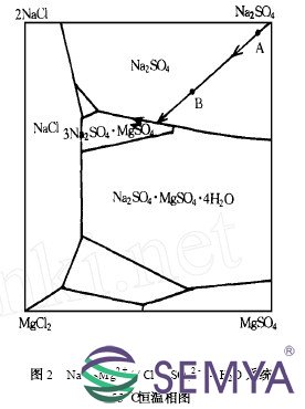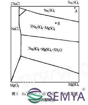 無水硫酸鈉生產(chǎn)所使用的原料中,除了主要的Na+ 、SO42 -離子外,一般都含有少量的Ca2 + 、Mg2 + 、和Cl -離子,生產(chǎn)時(shí)蒸發(fā)器內(nèi)壓力、溫度等條件保持不變,隨著蒸發(fā)的進(jìn)行,結(jié)晶的硫酸鈉不斷取出, 料液中Ca2 + 、Mg2 + 離子濃度相對增大, 體現(xiàn)在Na + 、Mg2 + // Cl -、SO42--H2O 相圖上,如開始在A 點(diǎn),生產(chǎn)一段時(shí)間后體系移到B 點(diǎn)見圖2, 繼續(xù)生產(chǎn),體系逐漸由Na2SO4 的結(jié)晶區(qū)移到Na2SO4 與復(fù)鹽3Na2SO4 ·MgSO4 的共飽線上,此時(shí)無水鈉鎂礬開始析出,在操作溫度不變情況下,體系將沿此共飽線移動(dòng),產(chǎn)品質(zhì)量開始下降。如果溫度升高時(shí),Na2SO4 的結(jié)晶區(qū)逐漸縮小,而3Na2SO4 ·MgSO4 的結(jié)晶區(qū)逐漸增大, 體系落在了3Na2SO4 ·MgSO4的結(jié)晶區(qū),顯然此時(shí)已不是我們所需要的產(chǎn)品了見圖3 。由于無水鈉鎂礬的結(jié)晶顆細(xì)小,在粘度較大的硫酸鈉溶液中不易沉降,蒸發(fā)罐內(nèi)就會呈現(xiàn)糊狀,使蒸發(fā)無法正常進(jìn)行,結(jié)晶也不會再繼續(xù)長大,排出的料液經(jīng)離心機(jī)脫水非常困難,濕硝中母液含量較大,氣流干燥也無法正常運(yùn)行,產(chǎn)品放置時(shí)間長了便結(jié)為大塊。為避免上述現(xiàn)象發(fā)生,除對硝液進(jìn)行凈化外,應(yīng)適當(dāng)降低排料溫度,即降低蒸發(fā)終溫。從圖2 、圖3 中可以看出,Na2SO4的結(jié)晶區(qū)隨著溫度的降低而增大,這不僅提高了產(chǎn)品產(chǎn)量,而且極大的降低了雜鹽的析出量,大大提高了產(chǎn)品質(zhì)量。那么是不是排料溫度越低越好呢? 也不是,圖4 是Na2SO4 -H2O 系統(tǒng)相圖,從圖中可以看出,硫酸鈉溶解度在32138 ℃最大,低于此溫度時(shí),系統(tǒng)不再結(jié)晶Na2 SO4 , 而是結(jié)晶出Na2 SO4 ·10H2O 。當(dāng)料液溫度接近32138 ℃時(shí), 由于硫酸鈉溶解度增大,產(chǎn)量將受到影在水中響, 這對生產(chǎn)是不利的。